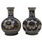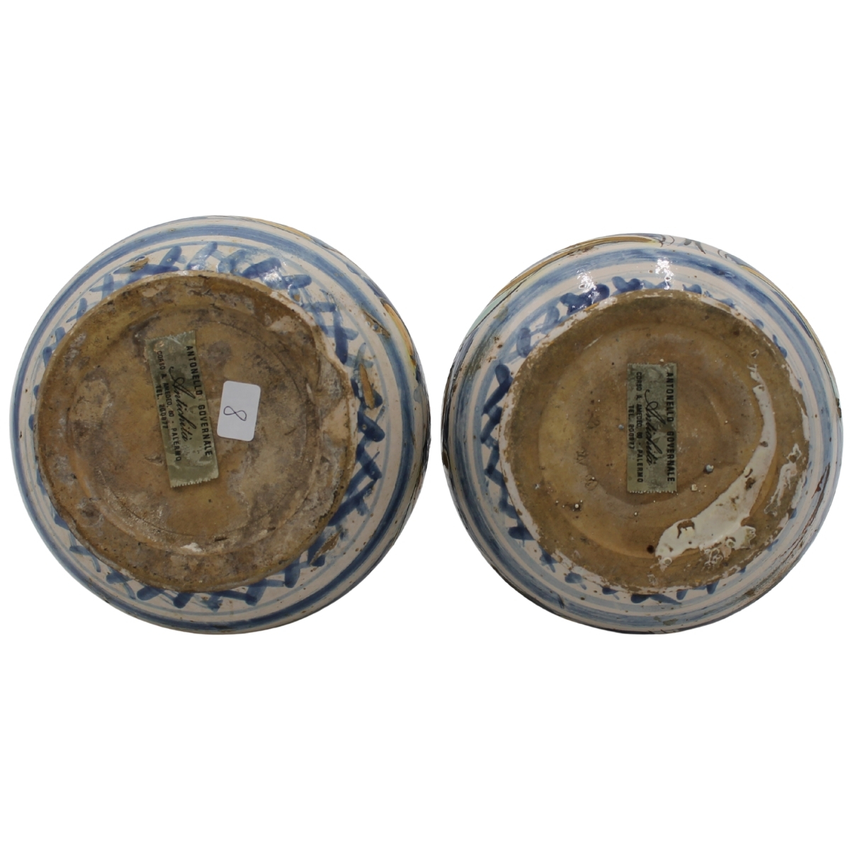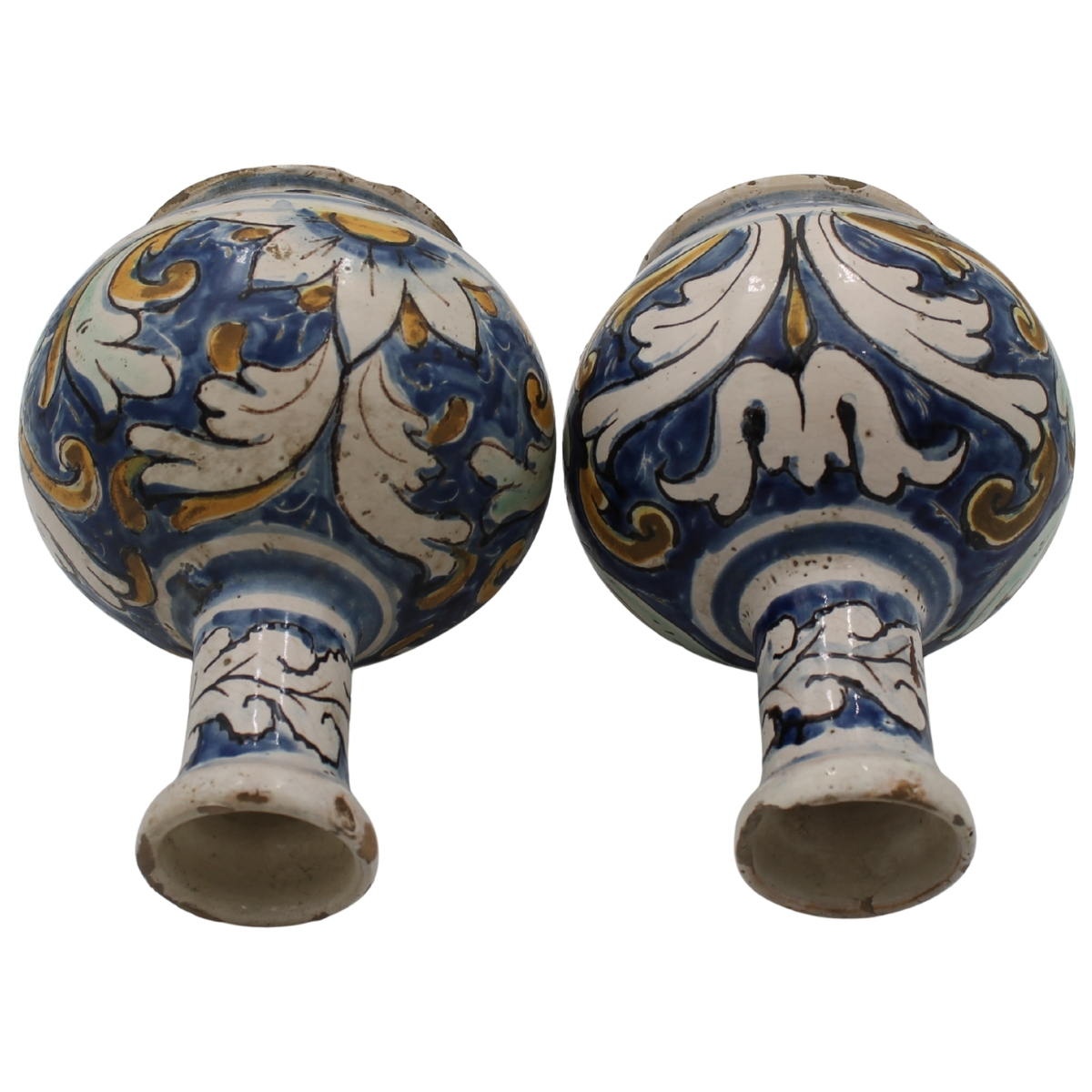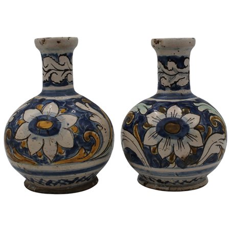 Coppia di bottiglie Antica maiolica decorate a tutto tondo a motivi floreali e vegetali policromi (lievi sbeccature al collo). Caltagirone. Secolo XVIII. Cm h 24