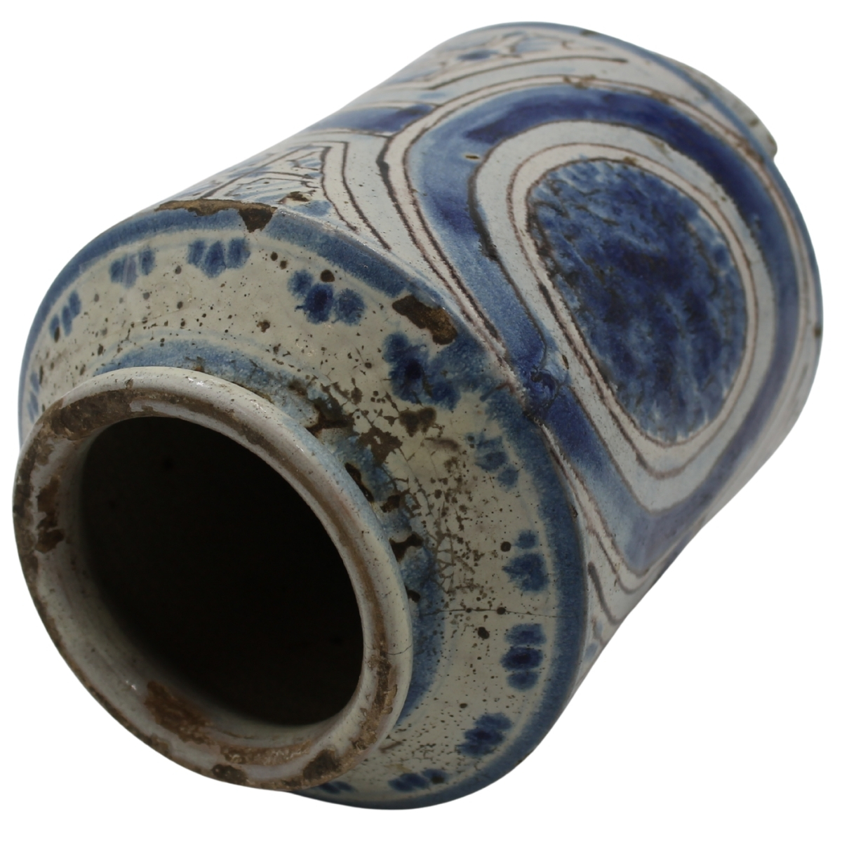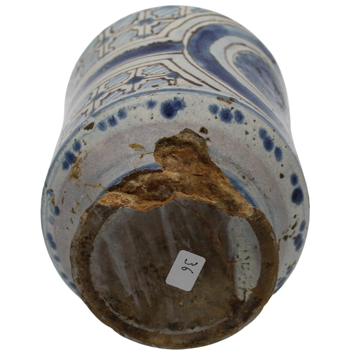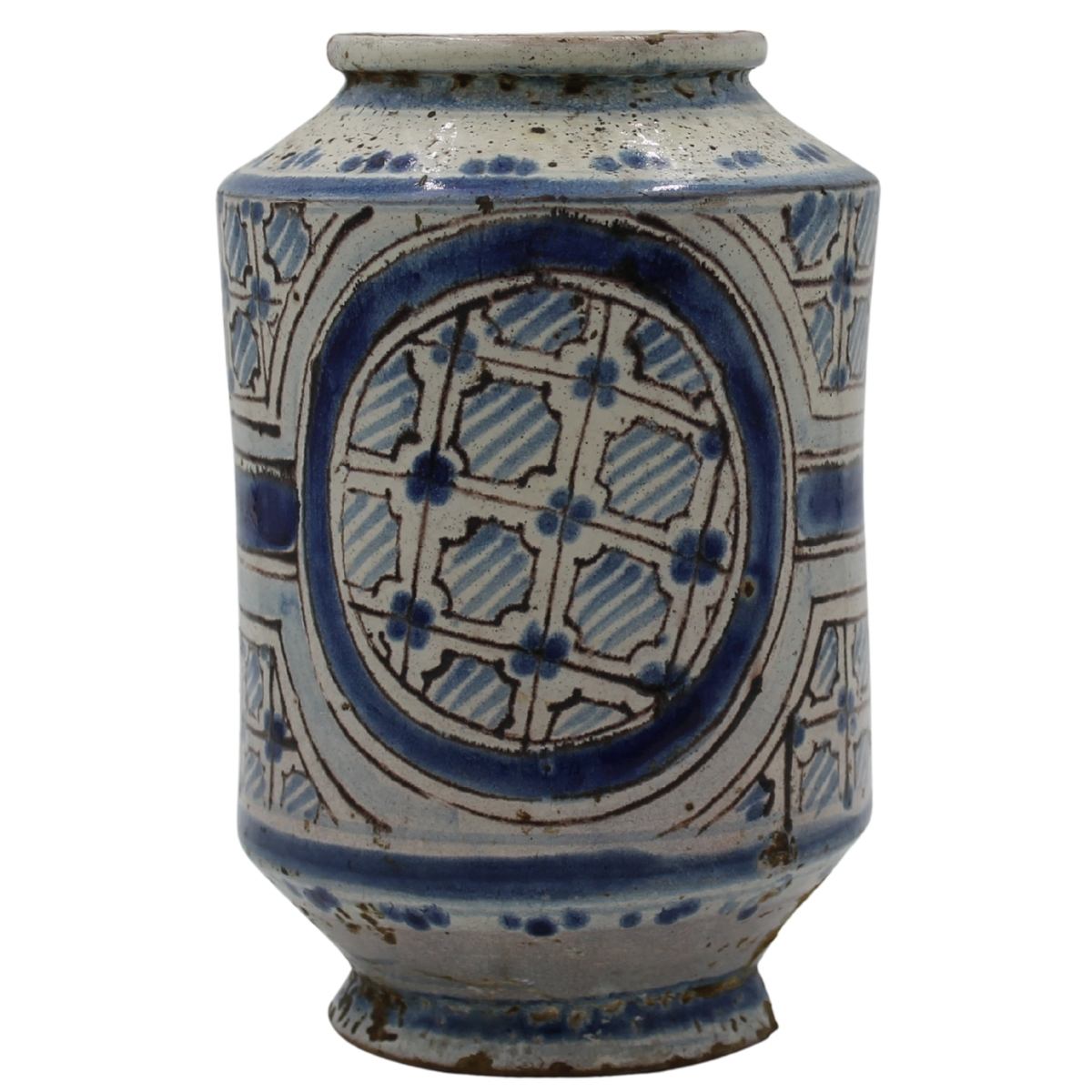 Cilindro Antica maiolica con decoro a tutto a motivi geometrici policromi (mancanze alla base). Caltagirone. Seconda metà del secolo XVIII. Cm h 23