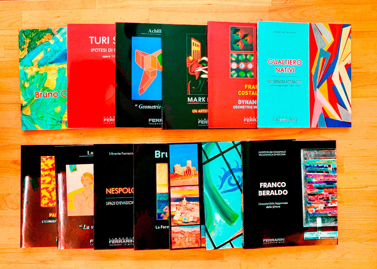 Interessante lotto di 13 cataloghi editi dall Galleria Ferrarin, Legnago, relativi ai seguenti artisti: Achille Perilli, Mark Kostabi, Franco Costalonga, Luca Linari, Paola Bernardi, Gualtiero Nativi, Bruno Saetti, Virgilio Guidi, Salvatore Magazzini, Franco Beraldo, Ugo Nespolo, Turi Simeti e Bruno Ceccobelli