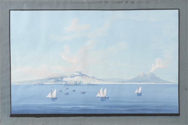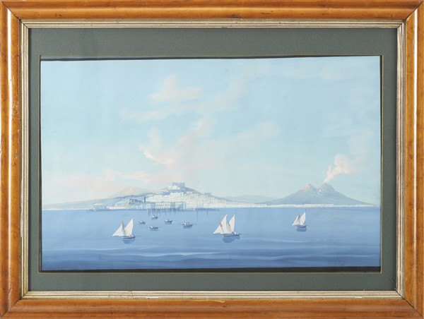 Neapolitan School. *View of the Bay of Naples with Eruption of Vesuvius*, gouache on paper (38 × 60 cm). In frame (defects).