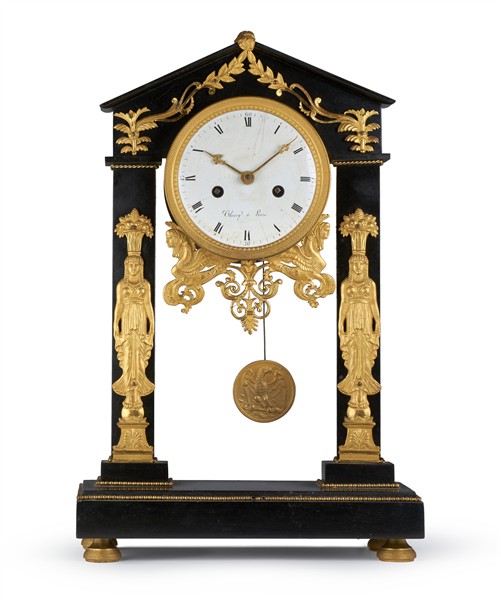 Pendola a portico con cassa in marmo nero e fregi in bronzo dorato di ispirazione "Retour d'Egypte". Quadrante in smalto bianco a numeri romani, movimento a due treni con suoneria delle ore e mezze su campanello. Francia, primo quarto del secolo XIX (h. cm 40) (difetti)