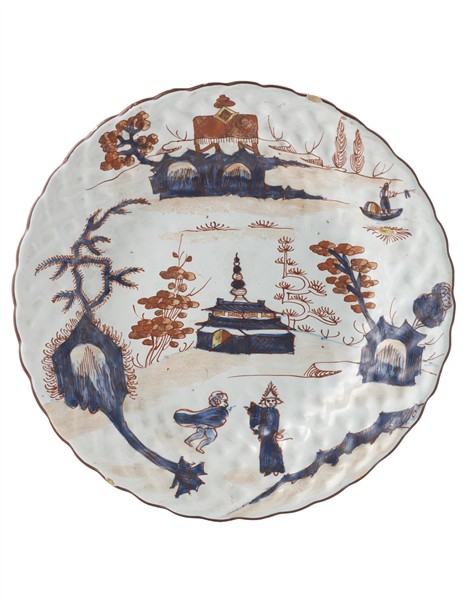 Piatto a profilo mistilineo in maiolica decorato a rilievo a cestino di vimini intrecciato, con decorazione "alla pagoda" in rosso, blu e oro, bordo profilato in rosso-bruno (d. cm 22,5) (difetti e sbeccature)