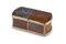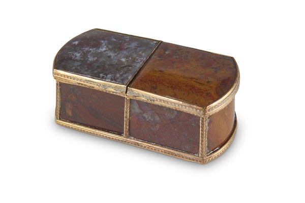 Snuff-box a doppio scomparto "a cage" con pannelli in diaspri policromi. Montature e ghiere in metallo dorato. Secolo XIX (cm 9x3x4,5) (difetti)