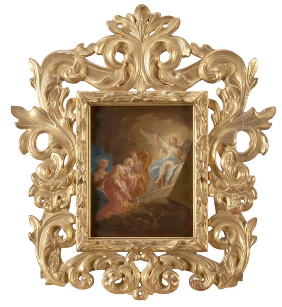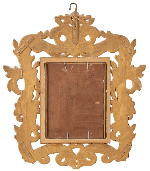 in cornice coeva in legno intagliato, traforato e dorato