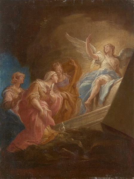 Maestro del secolo XVIII "L'Angelo e le Marie al sepolcro" olio su tela applic
