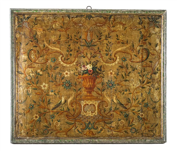 Pannello in legno dipinto e laccato in policromia centrato da vaso con composizione floreale tra volute, fiori, melograni e volatili su fondo dorato a mecca. Italia settentrionale, secolo XVIII. In cornice a finto marmo (cm 111x94,5) (difetti e restauri)