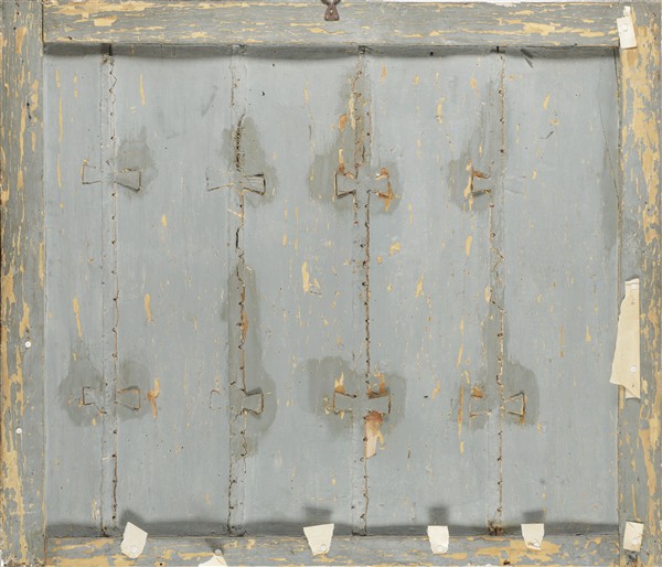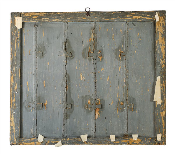 Pannello in legno dipinto e laccato in policromia centrato da vaso con composiz