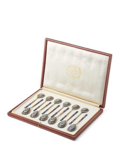 Set of twelve spoons in silver, vermeil, and polychrome enamels with floral decoration and beaded borders, twisted (torchon) handles. Russia, late 19th century (g 150) In a red morocco leather case with gilt tooling (defects)