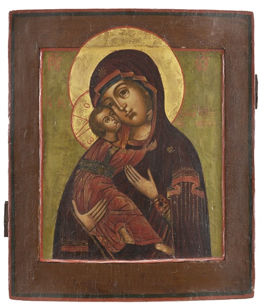 Arte russa, secolo XIX. Madonna Feodorovskaya, icona a tempera su tavola e oro (cm 31x27) (difetti)