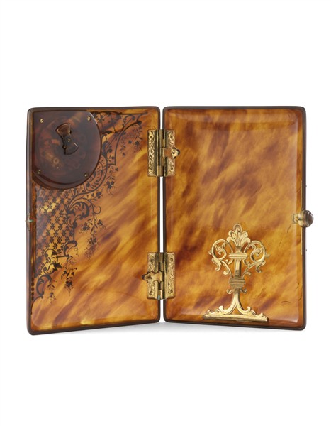 Arte del secolo XIX. Portabiglietti in tartaruga, coperchio con decoro piqué-posé in oro e argento con orologino in smalto bianco a numeri arabi, cerniere in argento, chiusura con cabochon in corniola (cm 7,5x10,5) (difetti e mancanze)