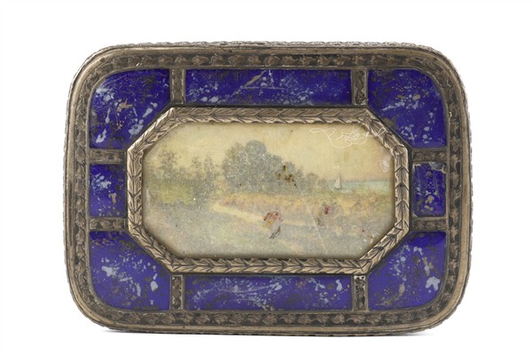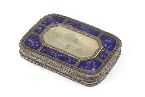 Rectangular silver pillbox with lapis lazuli inserts on the lid, centered with a miniature depicting a rural landscape with trees, a meadow, and a river; the reverse engraved with a stylized decoration; gilt (vermeil) interior.