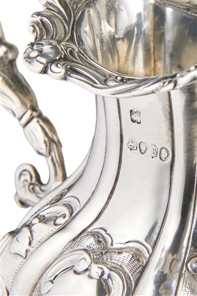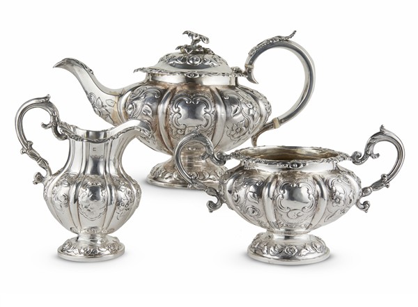 Lotto in argento composto da teiera, zuccheriera e lattiera riccamente decorati a motivi vegetali, presa a fiore. Londra, 1837. Argentiere Hayne and Cater (g lordi 1350) (h. tot cm 17) (difetti)