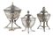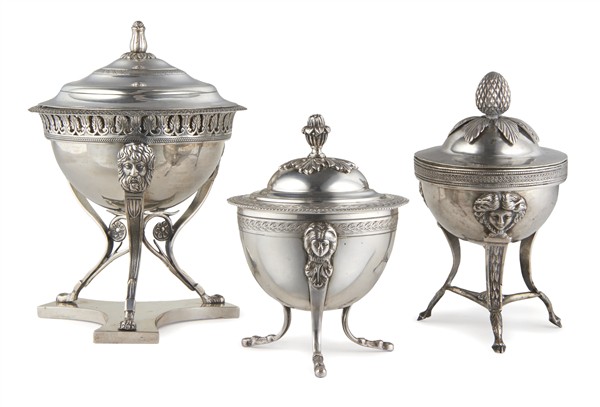 Lotto composto da tre zuccheriere in argento con coperchi a prese a tutto tondo, montanti decorati a mascheroni. Due con marchi Lombardo-Veneto, secolo XIX (g 730) (h. max cm 16,5) (difetti)