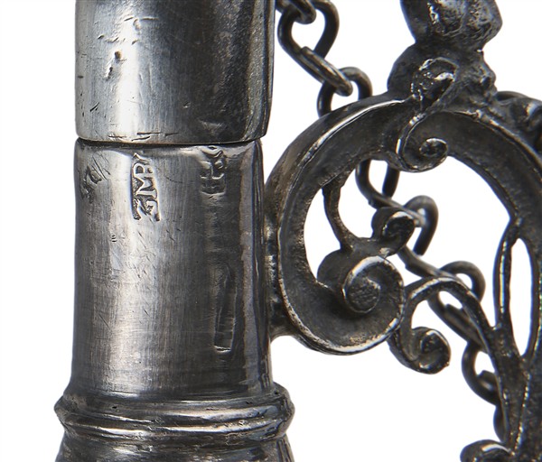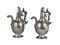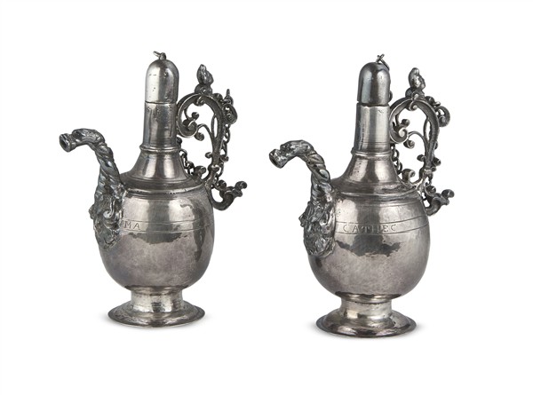 Pair of silver liturgical ampullae with screw caps, handles decorated with scrolls and topped with a male profile, anthropomorphic spout supported by a mascaron, inscribed "Oleum Cathec" and "Chris Ma". Late 18th–early 19th century (gross weight 370 g) (h. 14 cm) (defects)