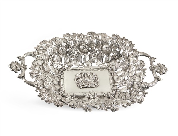 Silver basket richly repoussé and chased with roses and flowers, handles shaped as cornucopias. Austria, 19th century (300 g) (34 × 7 × 21 cm) (defects)