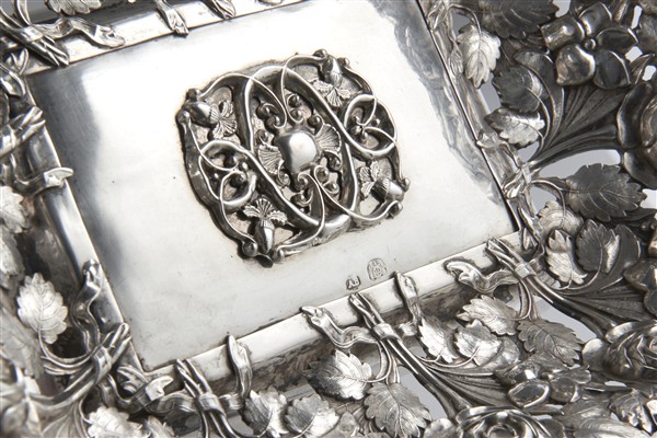 Cestino in argento riccamente sbalzato e cesellato a rose e fiori, anse a cornu
