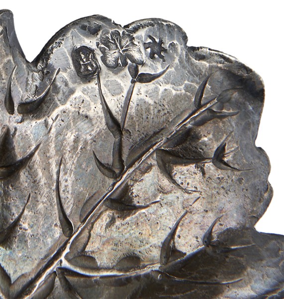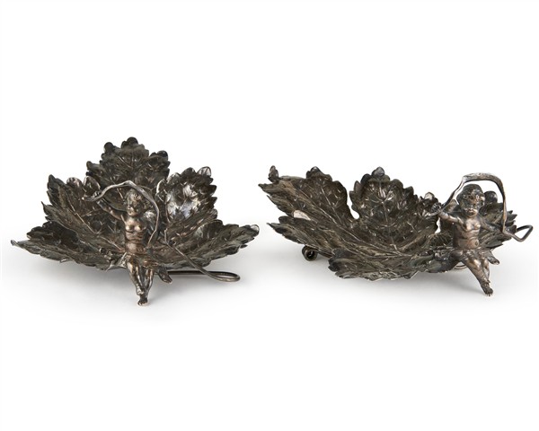 Pair of grapevine leaf-shaped centerpieces with fully rounded putto handles (390 g) (max L. 19.5 cm) (defects)