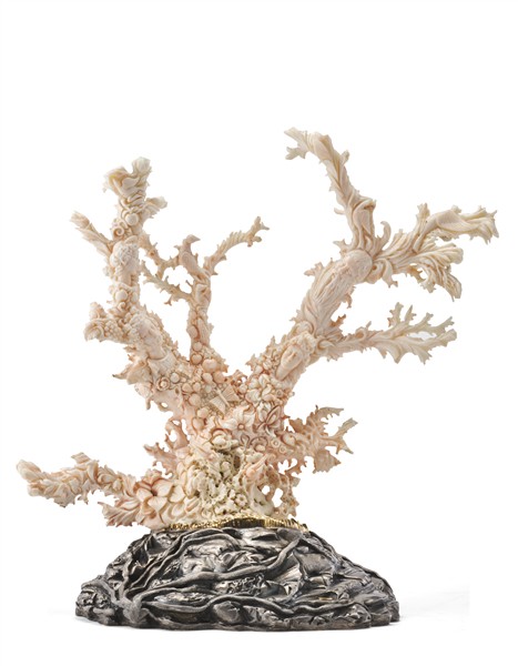 Manifattura di Torre del Greco, ambito di Carlo Parlati (1934-2003) metà del secolo XX. "Le quattro stagioni" ramo di corallo bianco finemente scolpito, montato su base in argento a finta roccia con ghiera in oro 18Kt (cm tot 33x33x15; solo corallo h. cm 26) (lievi difetti)