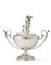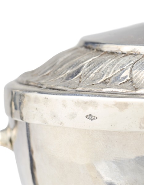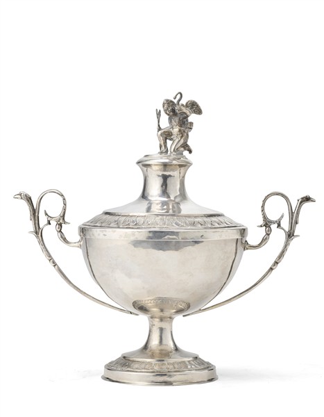 Two-handled silver sugar bowl with bands decorated with palmettes, circular base, and lid finial in the form of a fully rounded angel with bow and quiver; pierced handles with foliate scrolls. Papal States, 19th century (350 g) (h. 20.5 cm) (defects)