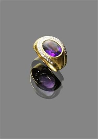 ANELLO Anello a fascia in oro giallo con ametista di taglio ovale e diamanti taglio brillante Peso gr 9,40 yellow gold band ring with oval cut amethyst and brillant cut diamonds Weight 9.40 gr