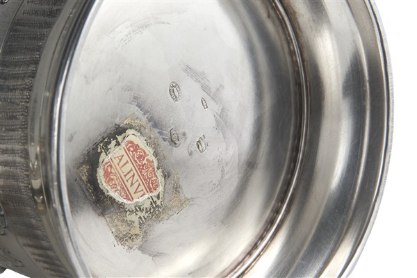Lotto composto da sei bicchierini in argento decorati a grappoli d'uva e pampini con medaglione centrale cifrato, uniti a un boccale in argento decorato a motivi geometrici e medaglioni centrati da mazzi di fiori. Milano, secolo XX. Argentiere Malinverni (g 1050) (h. max cm 14,5) (difetti)