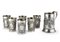 Set of six silver small cups decorated with grape clusters and vine leaves with a central medallion, together with a silver tankard decorated with geometric motifs and medallions centered with flower bouquets. Silversmith Malinverni, 20th century (1,050 g) (max h. 14.5 cm) (defects)