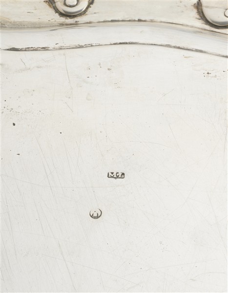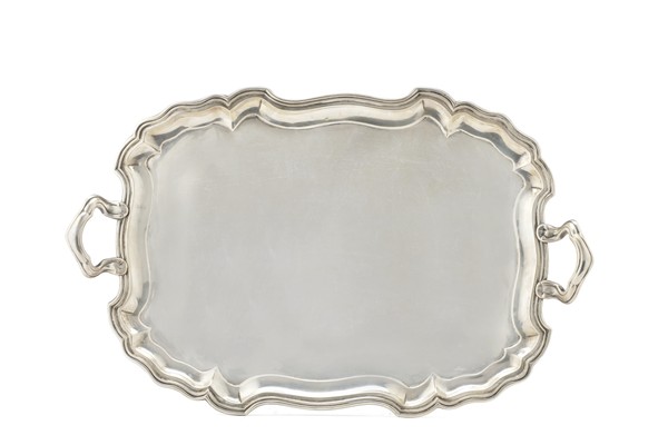 Two-handled silver tray with curvilinear fluted edge and shaped handles. Veneto, 19th century (1,130 g) (52 × 33 cm) (defects)