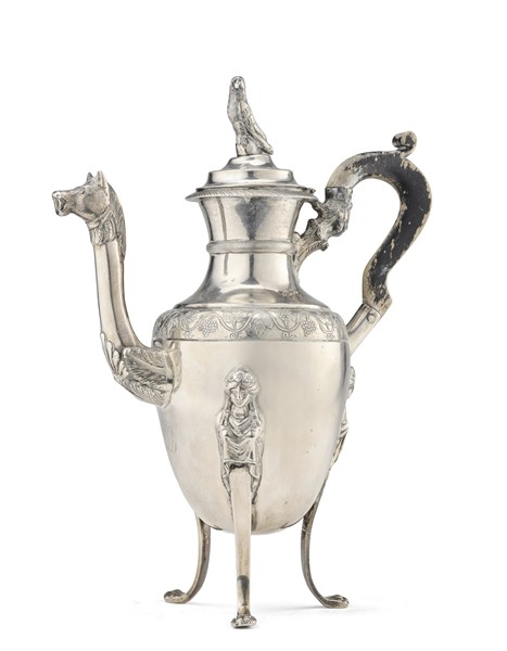 Caffettiera in argento inciso e sbalzato con beccuccio a testa di cavallo, fascia decorata a tralci di vite, sostegno tripode decorato all'attacco da Erme e terminante a zampe ferine, presa del coperchio in forma di volatile a tutto tondo. Manico sagomato in legno ebanizzato. Regno di Napoli, secolo XIX (g 650) (h. cm 29) (difetti)