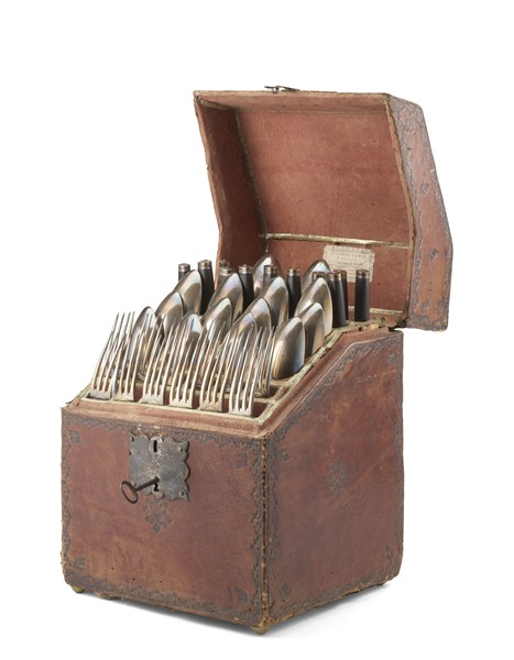 Porta posate da viaggio rivestito in marocchino impresso, serratura con chiave e ferramenta, contenente servizio in argento composto da: dodici forchette, dodici cucchiai, dodici coltelli con manici in legno ebanizzato e due posate a servire. Regno di Sardegna, secolo XIX. Argentiere GB. Marchio dell'assaggiatore Giuseppe Vernoni, Torino, 1822. Marchio degli 11 Denari per la finezza dell'argento (916/1000). Il baule recante etichetta della manifattura iscritta "GIUSEPPE CAMIN E FIGLIO Fanno ogni sorta di Stucchi e Bauli da argenteria e da viaggio in Casa del sign. Conte Sordevolo vicino a S. Tommaso in Torino" (g netti 2200) (cm custodia 24x31,5x21) (difetti)