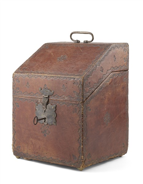 Travel cutlery case covered in gilt-stamped morocco, with lock and key, containing a silver flatware set composed of: twelve forks, twelve spoons, twelve knives with ebonized wooden handles, and two serving utensils. Kingdom of Sardinia, 19th century. Silversmith: GB. Assayer’s mark of Giuseppe Vernoni, Turin, 1822. “11 Denari” mark for silver fineness (916/1000). The case bears a label of the manufacturer inscribed: *“GIUSEPPE CAMIN E FIGLIO Fanno ogni sorta di Stucchi e Bauli da argenteria e da viaggio in Casa del sign. Conte Sordevolo vicino a S. Tommaso in Torino”*. Net weight 2200 g. Case dimensions: 24 × 31.5 × 21 cm. (defects).