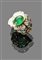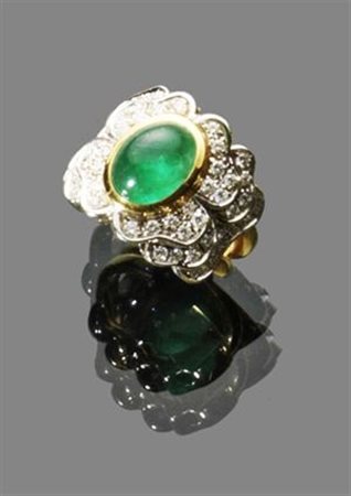 ANELLO Anello in oro bianco e giallo con smeraldo cabochon di carati 3 circa e diamanti taglio brillante per complessivi ct. 1 circa colore G purezza IF/WWS peso complessivo gr.. 13,30 yellow and whtie ring with apprx 3 kt cabochon cut center emerald surrounded by approx 1 kt brillant cut diamonds with colo G and IF/WWS calrity weight gr .. 13.30
