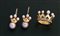DEMI PARURE DI FARAONE. In oro rosè 18 kt composta da coppia di orecchini a monachella aperta e da anello con motivi a coroncina decorati da perle coltivate di mm 9/4 ca. e diamanti brown taglio brillante per tot. cts. 0,35 ca., completi di astucci originali.