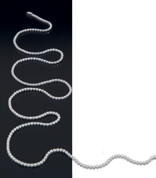 COLLANA. In oro bianco 18 kt a maglie incernierate interamente in diamanti taglio brillante per tot. cts. 11,50 ca. entro castoni a quattro griffes.