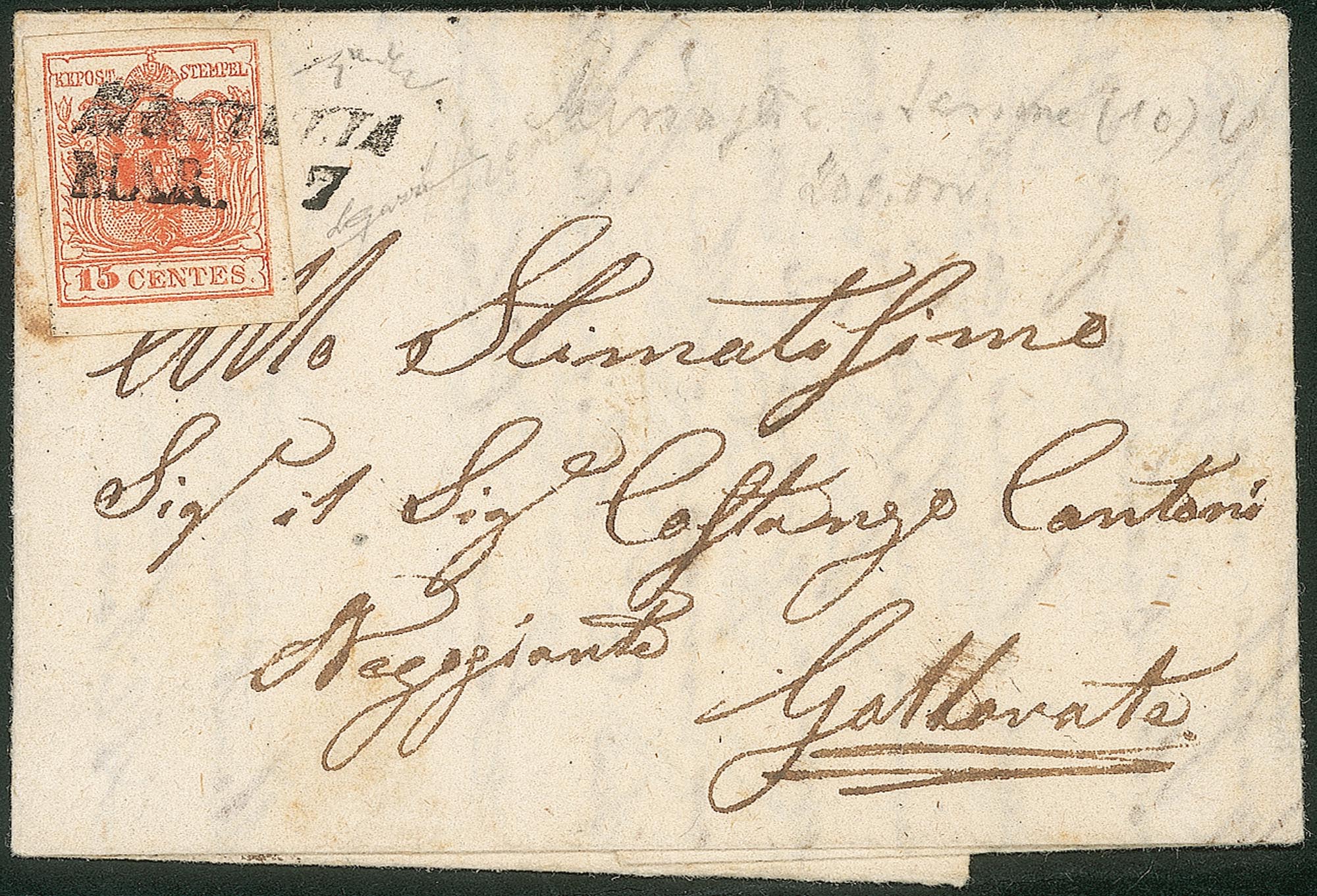 Antichi Stati Italiani - Lombardo Veneto - Annullamenti - Missaglia (stampatello inclinato - P.ti 10)Lettera del 7.3.1858 per Gallarate affrancata con 15 cent carta a mano terzo tipo (6) - cert. L. Gazzi