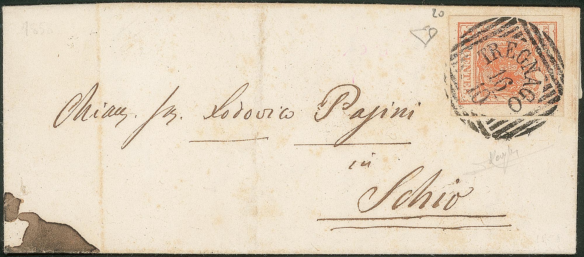 Antichi Stati Italiani - Lombardo Veneto - Annullamenti - Tregnago (linee orizzontali e verticali - P.ti 7)Lettera del 16.10 per Schio affrancata con 15 cent terzo tipo carta a macchina (20)