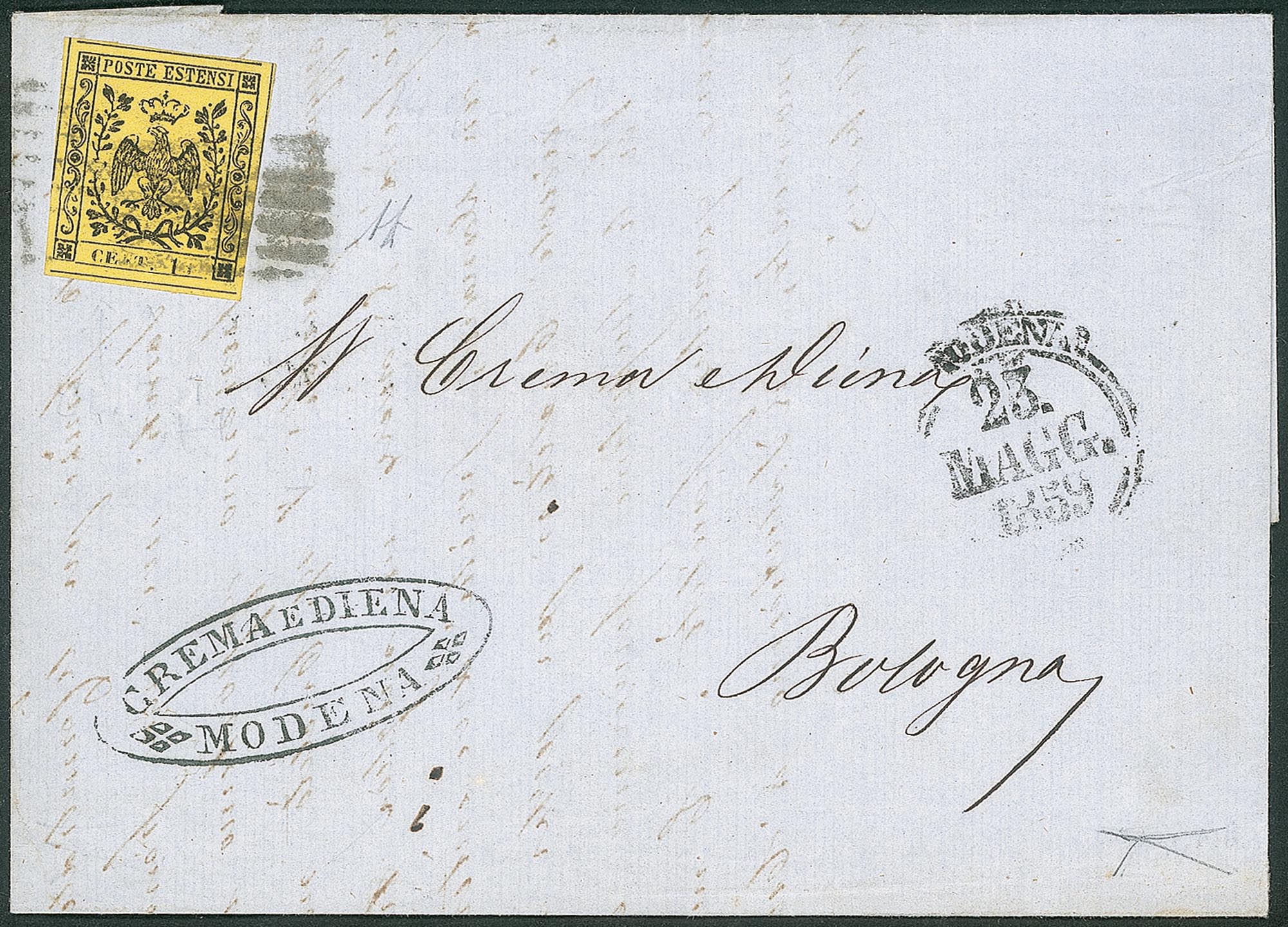 Antichi Stati Italiani - Modena - Lettera da Modena a Bologna in Governo Provvisorio23 maggio 1859 con 15 cent. giallo con lett. N e cifra 5 debolmente impresse (Sass. 3 - cfr. pag. 135) - Rarità cert. Bottacchi