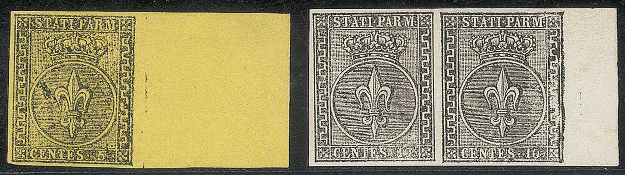 Antichi Stati Italiani - Parma - 1852 - Piccolo insiemeCon 5 cent giallo con ampio bordo di foglio + coppia del 10 cent bianco con bordo foglio (1 + 2) - nuovi con gomma originale - Diena