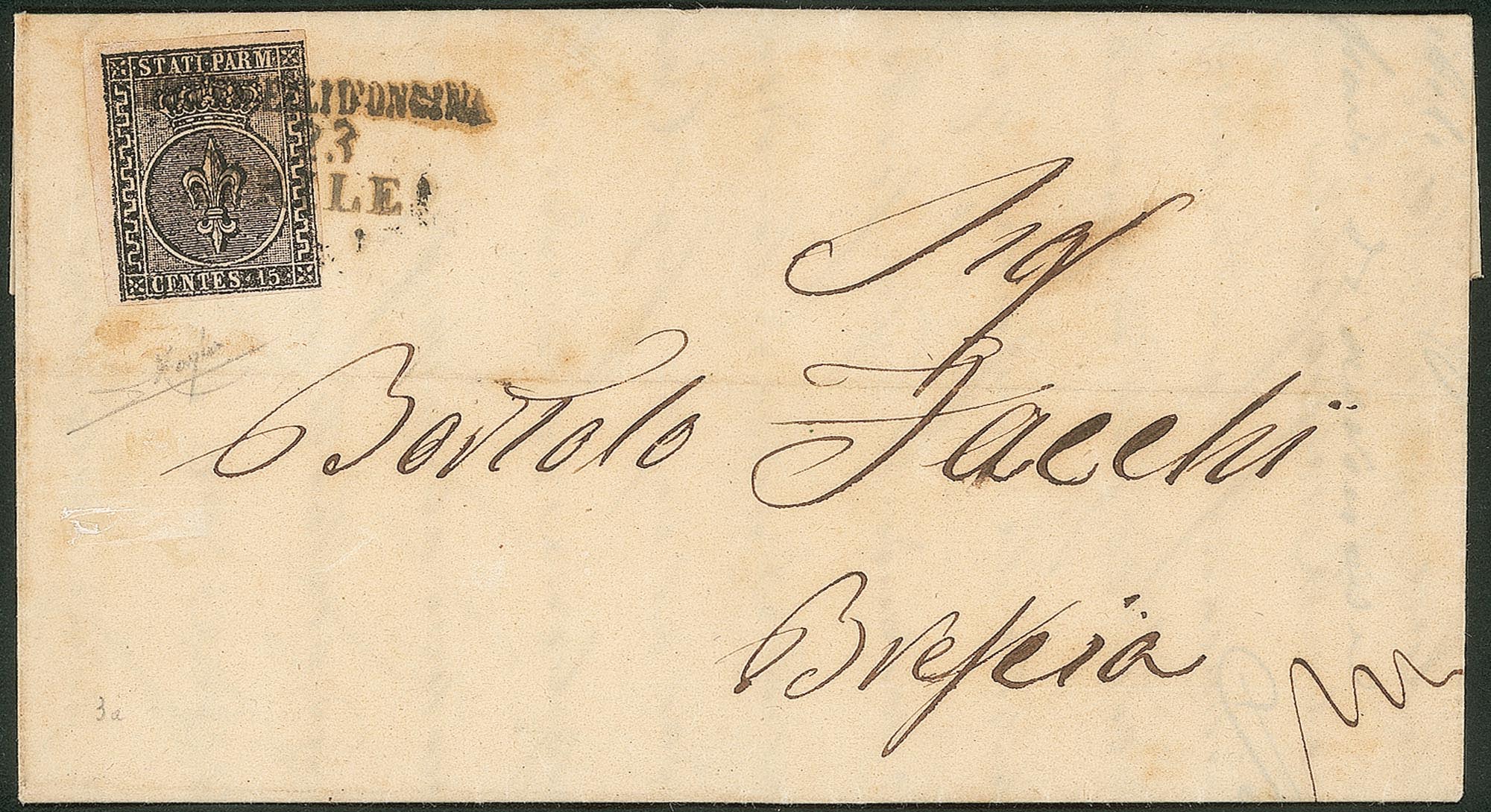 Antichi Stati Italiani - Parma - 1857 - Lettera con 15 cent rosa chiaro (3a)Da Monticelli d'Ongina 23 aprile 57 per Brescia - cert. Raybaudi