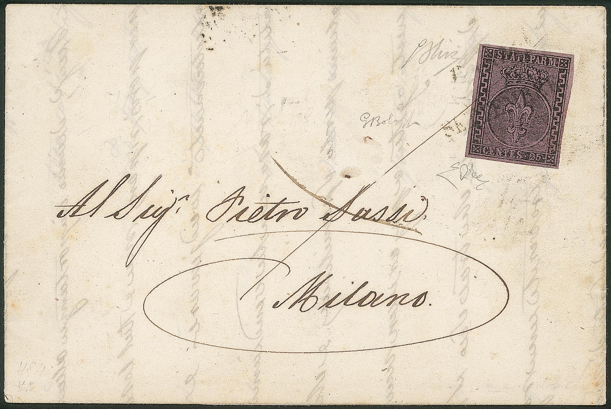 Antichi Stati Italiani - Parma - Lettera da Parma a Milano con 25 cent violetto (4b)Presenta la varietà greca larga a destra e a sinistra - Bolaffi + cert. E. Diena + cert. Oliva