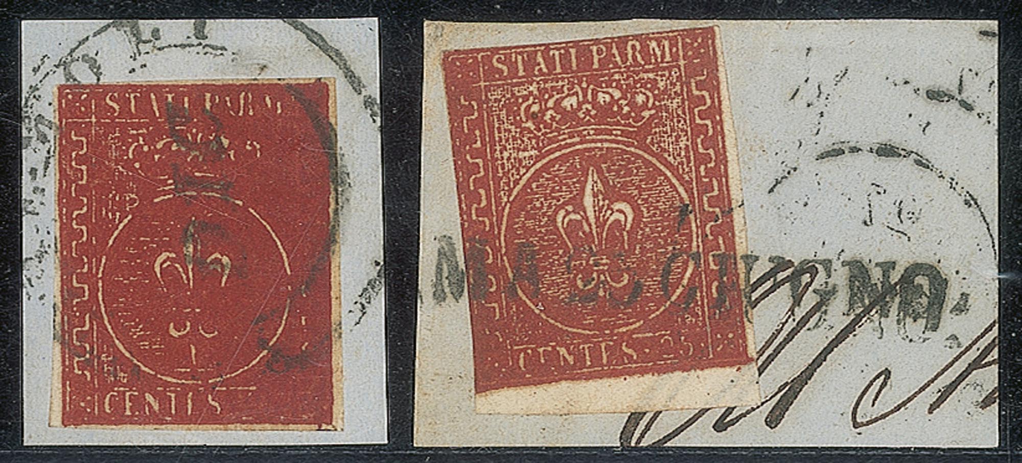 Antichi Stati Italiani - Parma - Due piccoli frammenti con 25 cent bruno (8)Con inchiostrazioni molto evidenti - il primo completamente privo della greca destra