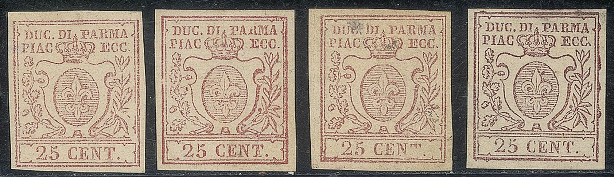 Lot 138 | Antichi Stati Italiani - Parma - 1857 - Lotto di quattro esemplari del 25 cent bruno lilla (10)