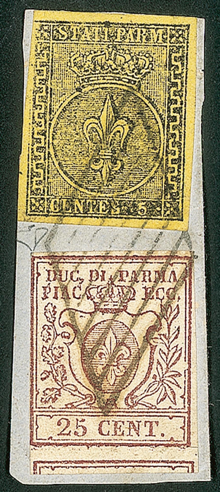 Antichi Stati Italiani - Parma - Miste di Emissioni diverse - Frammento con 5 cent giallo + 25 cent bruno (1 + 10)