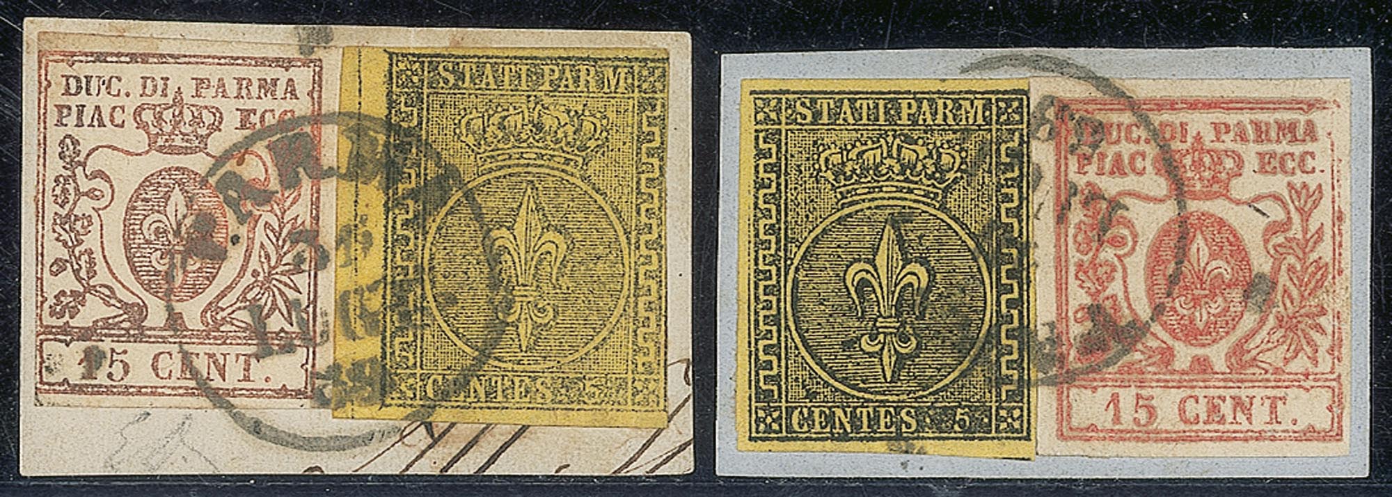 Lot 153 | Antichi Stati Italiani - Parma - Miste di Emissioni diverse - 1859 - Lotto di due frammenti con il 5 cent e il 15 cent (1 + 9)