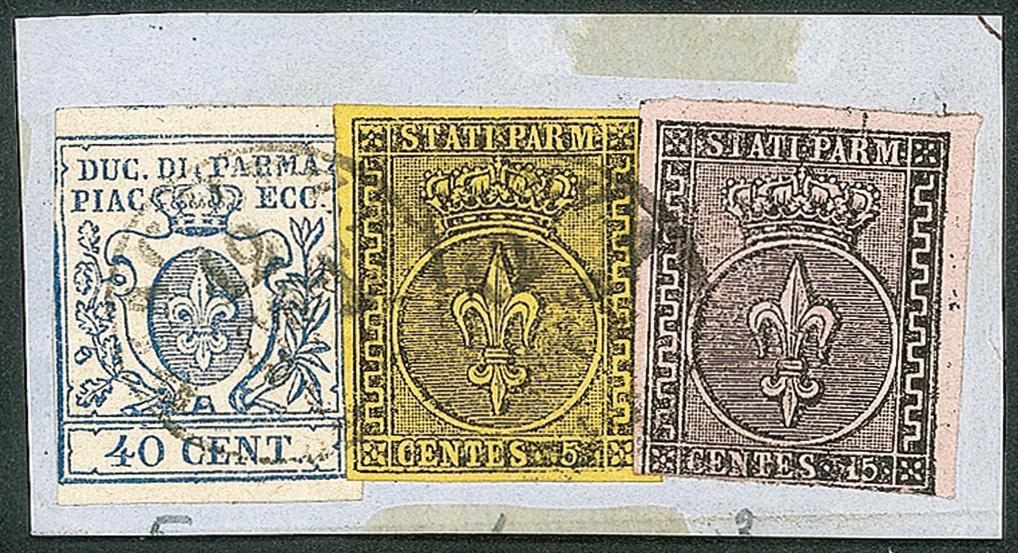 Antichi Stati Italiani - Parma - Miste di Emissioni diverse - Piccolo frammento in affrancatura mistaPrima emissione 5 cent giallo + 15 cent rosa + terza emissione 40 cent azzurro con 'zero largo' (1 + 3 + 11) con annullo Piacenza 12 ott. - leggeri difetti ma insieme di ottimo aspetto - cert. Bottacchi