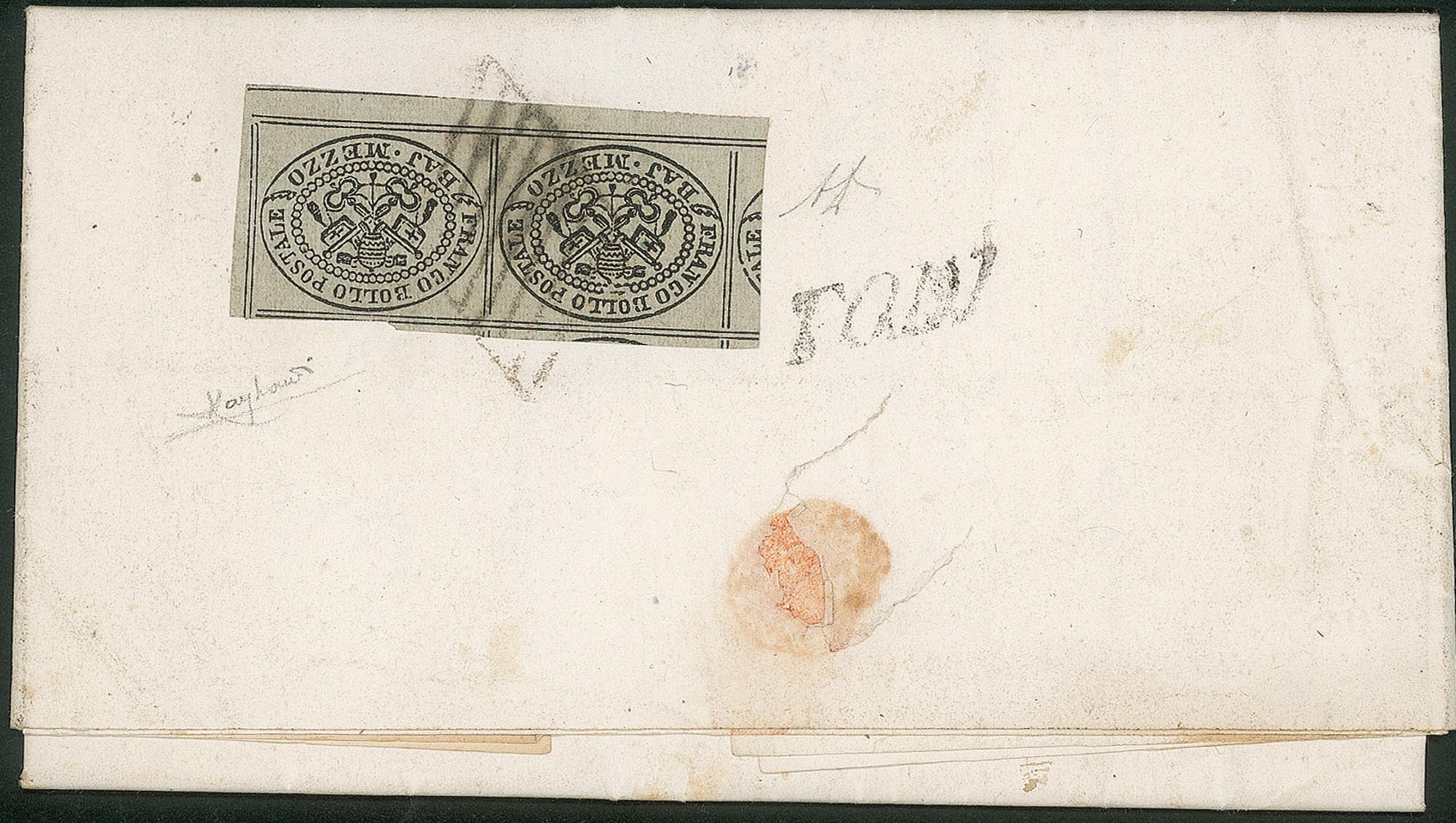 Antichi Stati Italiani - Stato pontificio - Lettera dell'Ospedale della Carità TuderteAffrancata al retro con bella coppia del 1/2 baj (1) con 8 filetti e interspazio di gruppo inferiore e annullata con griglia da Todi per Marciano del 10.1.59 - molto bella e fresca - Raybaudi + A. Diena