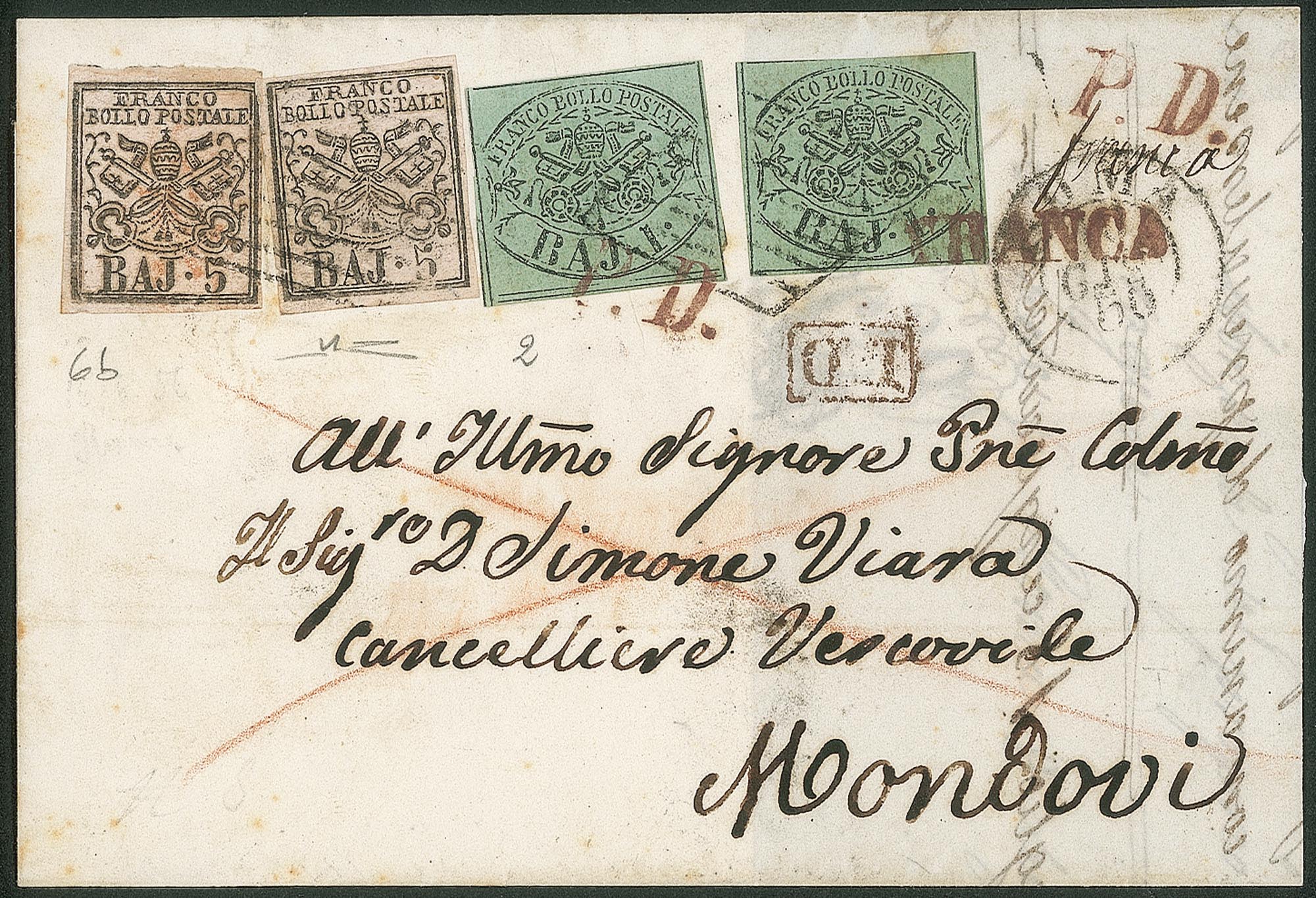 Con due es. del 1 baj verde + due es. del 5 baj stampa oleosa (Sass. 2, 6b) annullati con muto a losanga e co-annullati, in transito con P.D. e FRANCA entrambi in rosso di foggia sarda. Combinazione inedita. Stima p. 11. Cert. Manzoni