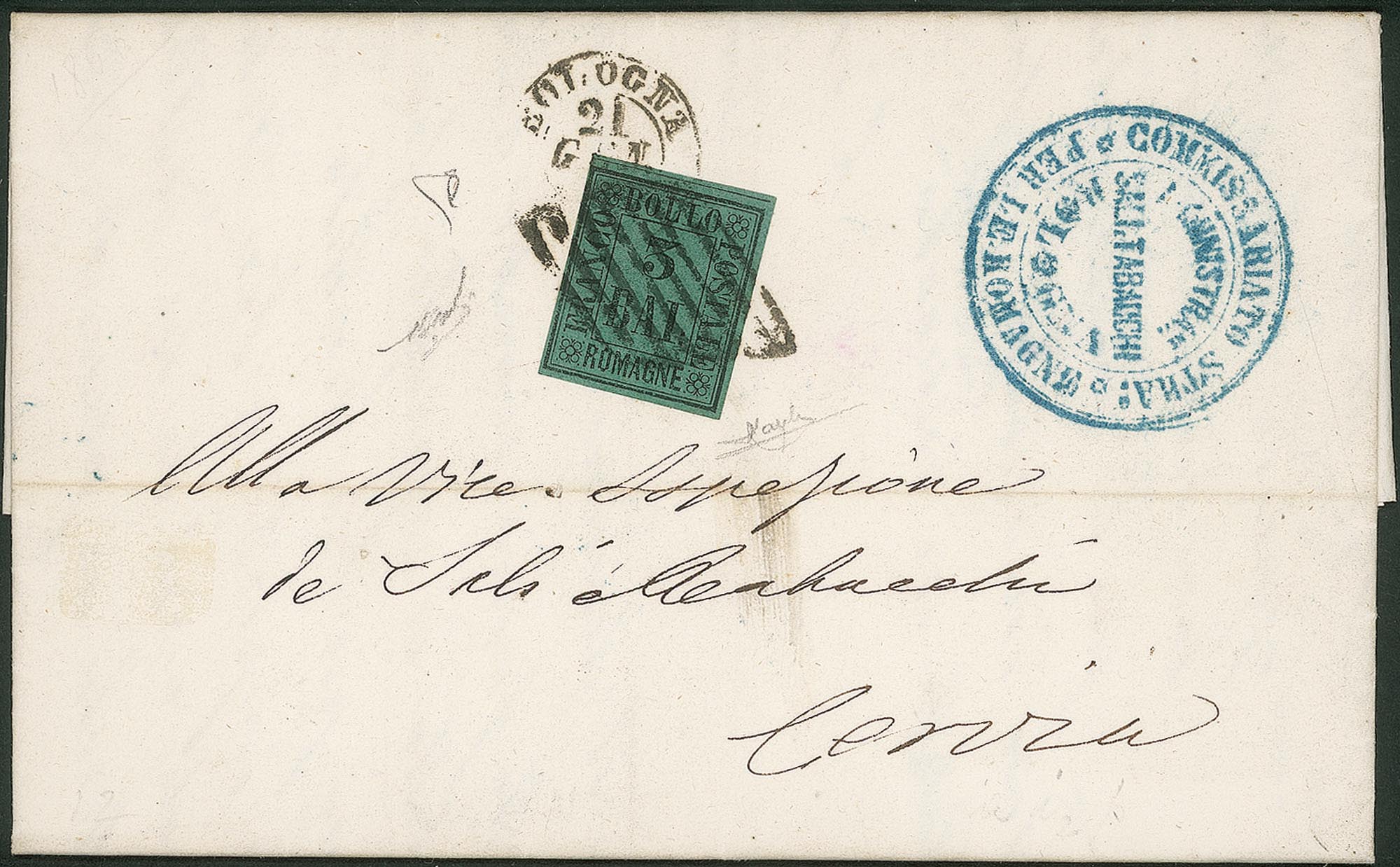 Antichi Stati Italiani - Romagne - 3 bai (4) isolato su lettera da Bologna (griglia + doppio cerchio)A Cervia del 21.1.1860 - buoni margini - M. Raybaudi + cert. Friedl + cert. En. Diena