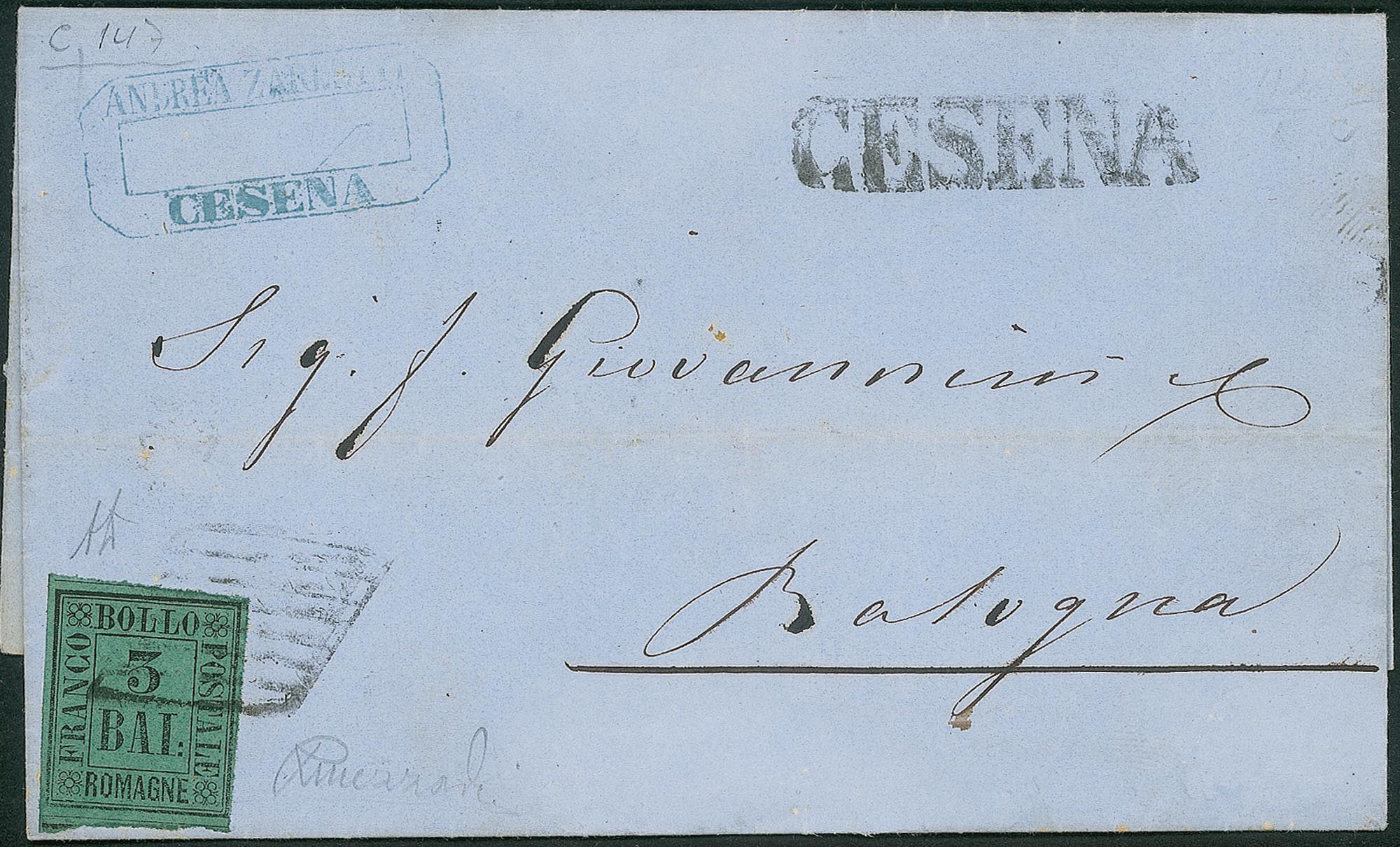 Antichi Stati Italiani - Romagne - 3 bai (4) isolato su lettera da Cesena a Bologna del 9.11.1859R. Mezzadri + A. Diena