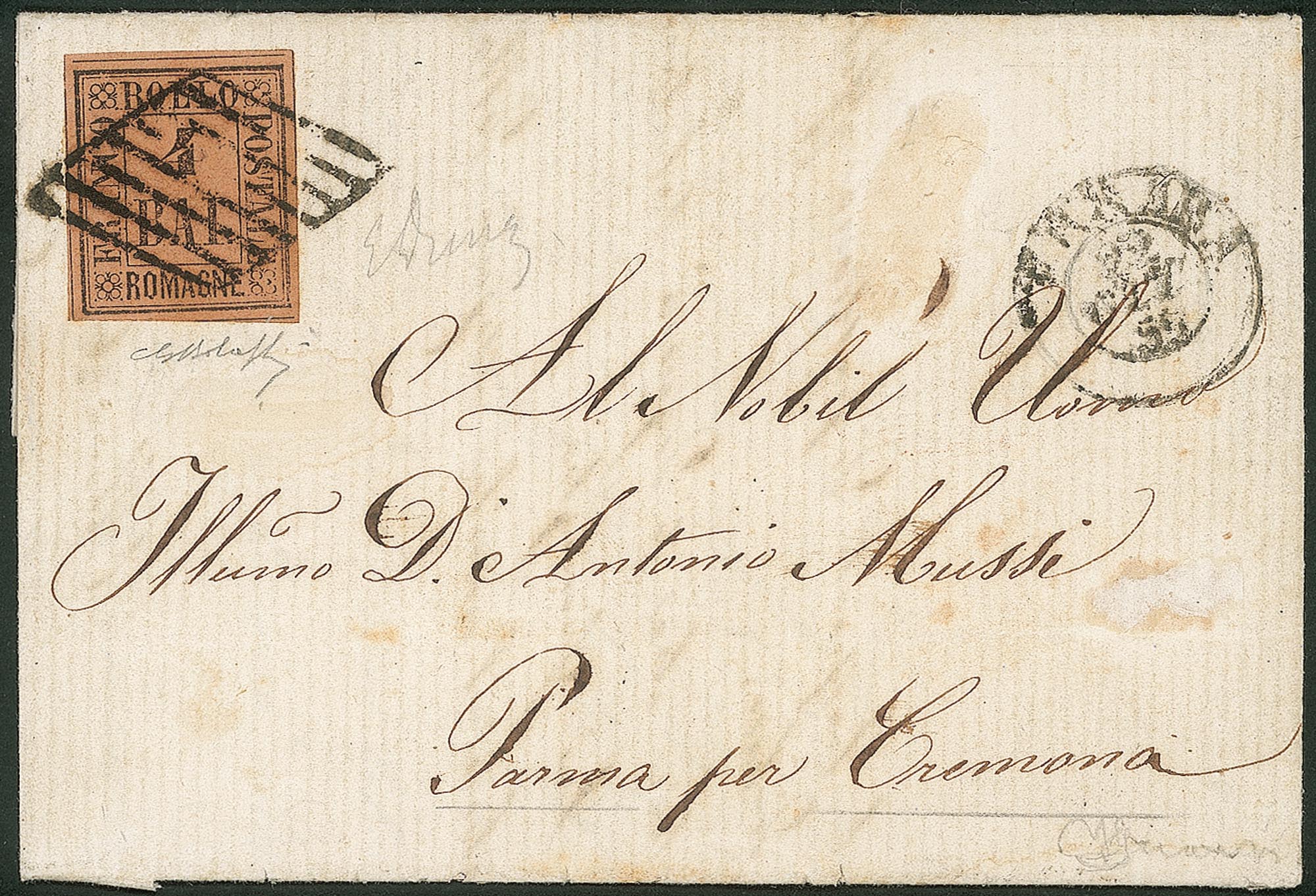 Antichi Stati Italiani - Romagne - Splendido esemplare del 4 bai fulvo (5)Su letterina da Ferrara a Parma per Cremona del 22.10.59 - molto bella - E. Diena + G. Bolaffi + F. Grioni
