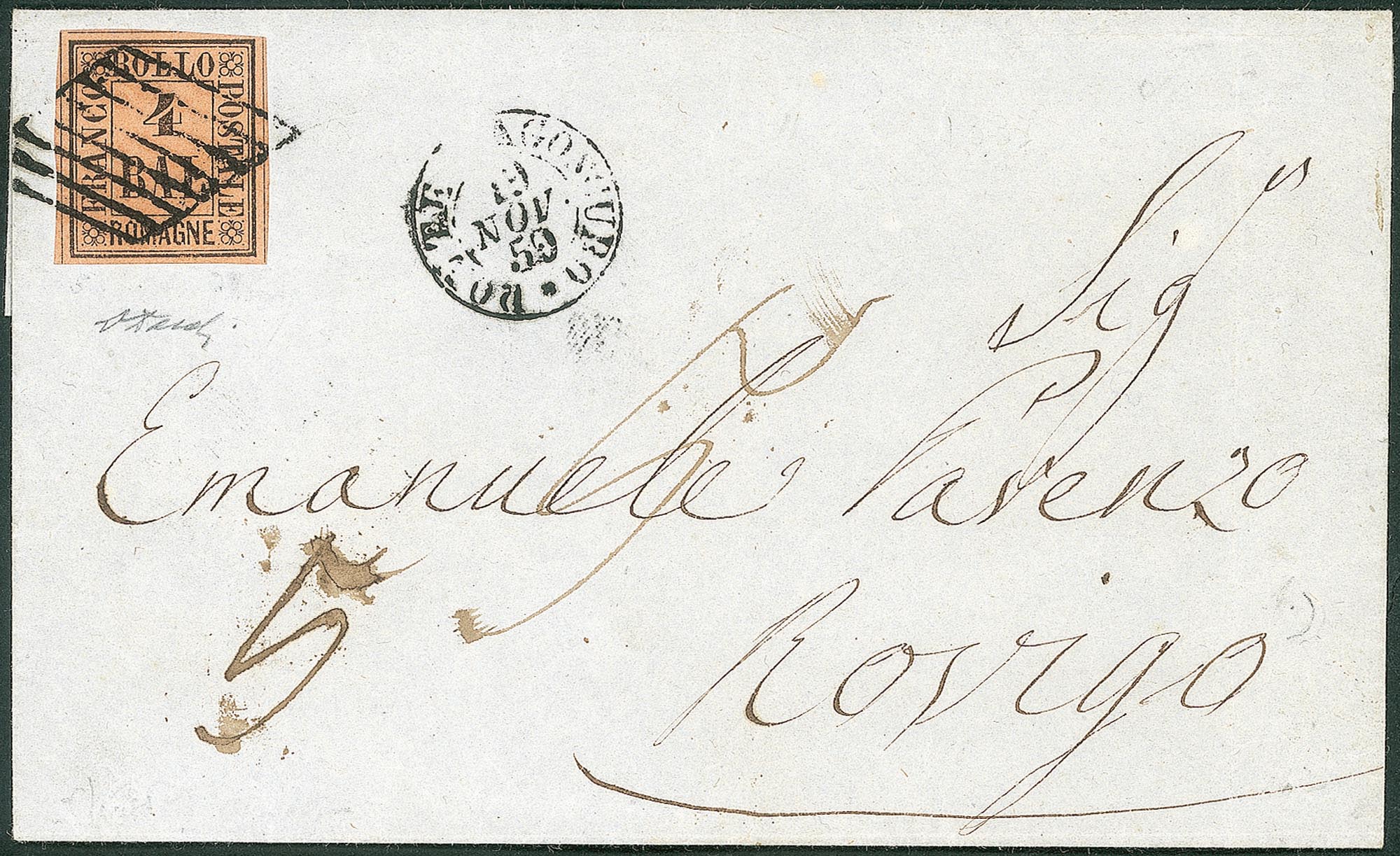 Antichi Stati Italiani - Romagne - Esemplare ottimamente marginato del 4 bai fulvo (5)Isolato su busta da Pontelagoscuro (doppio cerchio + griglia - P.ti 7) a Rovigo del 19.11.59 - molto bella e fresca